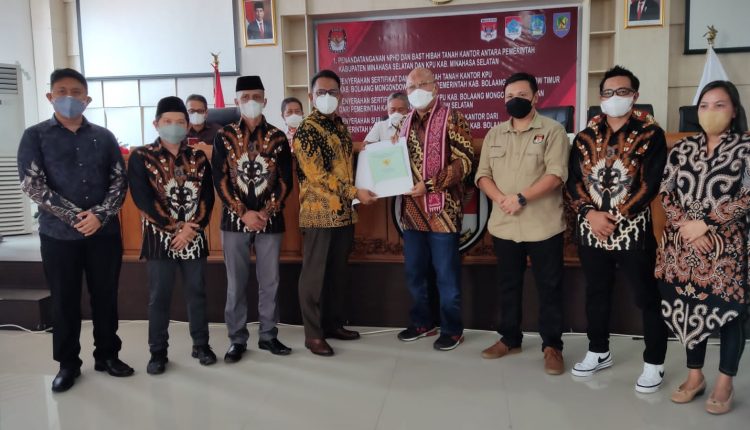 Sertifikat dan surat hibah tersebut diserahkan langsung oleh Bupati Boltim, yang diwakili oleh Asisten Bidang Pemerintahan dan Kesra Priyamos SH, dan diterima langsung oleh Ketua KPU RI Ilham Saputra, bertempat di Kantor Bupati Minahasa Selatan (Minsel), Sabtu (09/04).