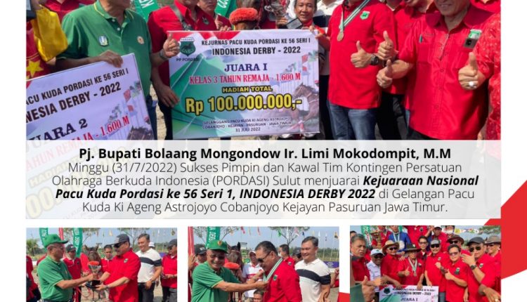 “Alhamdulillah, kuda milik bapak Gubernur Sulut Olly Dondokambey, juara Derby Indonesia tahun 2022. Ini semua berkat dukungan dan doa dari masyarakat Sulut,” ungkap Limi, yang juga Ketua KONI Bolmong terpilih tersebut.