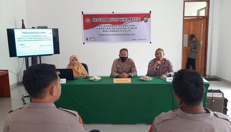 Telusur.news, Bolsel – Menjawab tantangan zaman, Kepolisian Resor (Polres) Kabupaten Bolaang Mongondow Selatan (Bolsel) melaksanakan kegiatan pelatihan Quick Wins tentang keterampilan dan etika pelayanan publik bagi anggota polri polres Bolsel, Sabtu (12/11/2022).