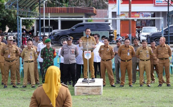 BOLTIM — Bupati Sam Sachrul Mamonto, memimpin Apel Kerja bersama Aparatur Sipil Negara (ASN) yang dilaksanakan di Kecamatan Nuangan, Senin (21/11/2022).