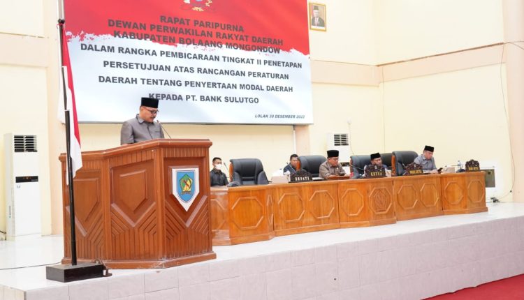 Telusur.news, Bolmong – Dewan Perwakilan Rakyat Daerah (DPRD) Kab. Bolaang Mongondow, Jumat (30/12/2022) melaksanakan Rapat Paripurna DPRD dalam rangka pembicaraan tingkat II Penetapan Persetujuan atas rancangan peraturan daerah tentang penyertaan modal daerah kepada PT. Bank SulutGo.