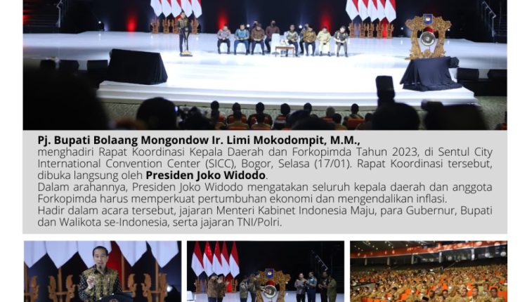 BOLMONG — Bupati Bolmong Limi Mokodompit menghadiri Rapat Koordinasi (Rakornas) kepala daerah dan Forum Komunikasi Pimpinan Daerah (Forkopimda) yang dibuka Presiden Republik Indonesia Joko Widodo. Kegiatan yang dipusatkan di Sentul Internasional Convention Center (SICC), Selasa (17/1) siang, dihadiri semua kepala daerah dan pimpinan legislatif se Indonesia.