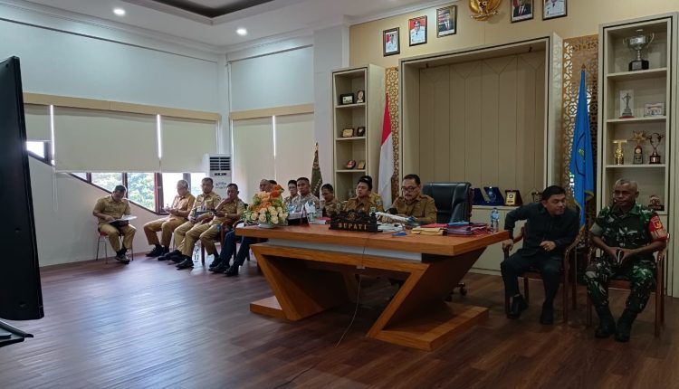 Rapat Koordinasi Pembahasan Langkah Konkret Pengendalian Inflasi di Daerah tahun 2023 yang berlangsung secara daring tersebut, berlangsung di Ruang Kerja Bupati pada Senin 30 Januari 2023.