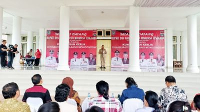 Bupati James Sumendap bersama rombongan Pemerintah Kabupaten (Pemkab) Mitra, disambut Limi Mokodompit, di Rumah Dinas (Rudis) Bupati, tepatnya di Desa Lalow, Kecamatan Lolak, Kabupaten Bolmong.