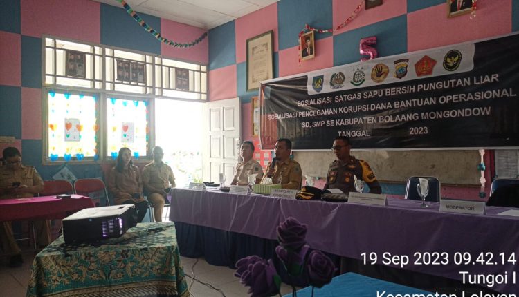 Telusur.news, BOLMONG — Pemerintah Kabupaten Bolaang Mongondow melalui Satuan Tugas Sapu Bersih Pungutan Liar (Satgas Saber Pungli) UPP Wilayah II Kabupaten Bolaang Mongondow terus berupaya untuk memberantas pratek-praktek pungli serta pencegahan korupsi dilingkungan Pemerintah Kabupaten Bolaang Mongondow melalui Kegiatan Sosialisasi yang bertajuk “Pemberantasan Pungutan Liar, Pencegahan Korupsi dan Pengawasan Pengelolaan Dana BOS Tahun 2023”