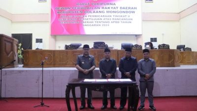 Telusur.news, BOLMONG — Dewan Perwakilan Rakyat Daerah (DPRD) Kabupaten Bolaang Mongondow (Bolmong), menggelar rapat paripurna dalam rangka pembicaraan tingkat II penetapan persetujuan atas Rancangan Peraturan Daerah (Ranperda) tentang APBD Tahun Anggaran 2024, kamis (30/11/2023).