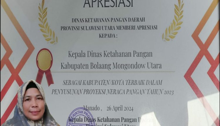 Telusur.news, BOLMUT – Dinas Ketahanan Pangan Daerah Sulawesi Utara memberikan apresiasi kepada Kepala Dinas (Kadis) Ketahanan Pangan (Ketapang) Kabupaten Bolaang Monggondow Utara Yulin Kohongia,SE sebagai Kabupaten / Kota Terbaik dalam Penyusunan Proyeksi Neraca Pangan Tahun 2023.