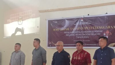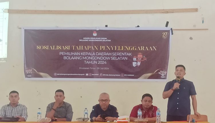 Telusur.news, BOLSEL – Komisi Pemilihan Umum (KPU) Kabupaten Bolaang Mongondow Selatan (Bolsel), menggelar Kegiatan Sosialisasi Tahapan Penyelenggaraan Pemilihan Kepala Daerah (Pilkada) Serentak Tahun 2024, yang dilaksanakan di Balai Desa Dumagin A, Kecamatan Pinolosian Timur (Pintim), pada Selasa, (09/07/2024).