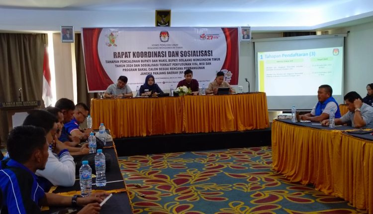 Telusur.news — Komisi Pemilihan Umum (KPU) Kabupaten Bolaang Mongondow Timur (Boltim) gelar rapat koordinasi dan sosialisasi tahapan pencalonan Bupati dan Wakil Bupati Kabupaten Bolaang Mongondow Timur Tahun 2024 dan sosialisasi terkait penyusunan visi misi dan program bakal calon sesuai rencana pembangunan jangka panjang (RPJPD). Selasa 30/07/2024.