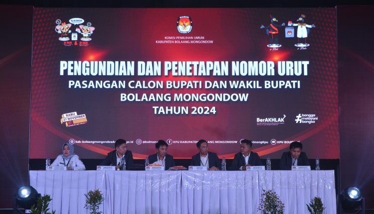 TELUSUR.NEWS — Komisi Pemilihan Umum (KPU) Bolaang Mongondow (Bolmong) adalah salah satu lembaga penyelanggara yang menggelar Rapat Pleno terbuka Penetapan Nomor Urut Pasangan Calon Bupati dan Wakil Bupati Pada Pilkada 2024., di Gedung Bagas Raya, Yadika, Kopandakan II, Senin, 23/09/2024.