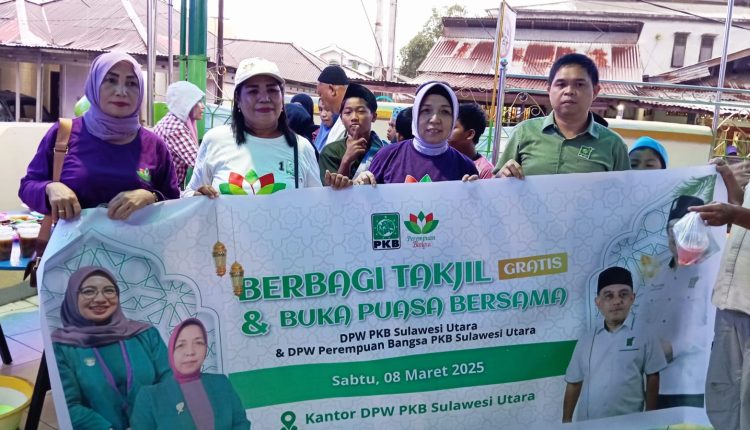 Telusur.news, SULUT— Dewan Pengurus Wilayah (DPW) Partai Kebangkitan Bangsa (PKB) Bersama Perempuan Bangsa Provinsi Sulawesi Utara membagikan takjil gratis kepada masyarakat pada sejumlah masjid di Kota Manado, Sabtu (8/3).