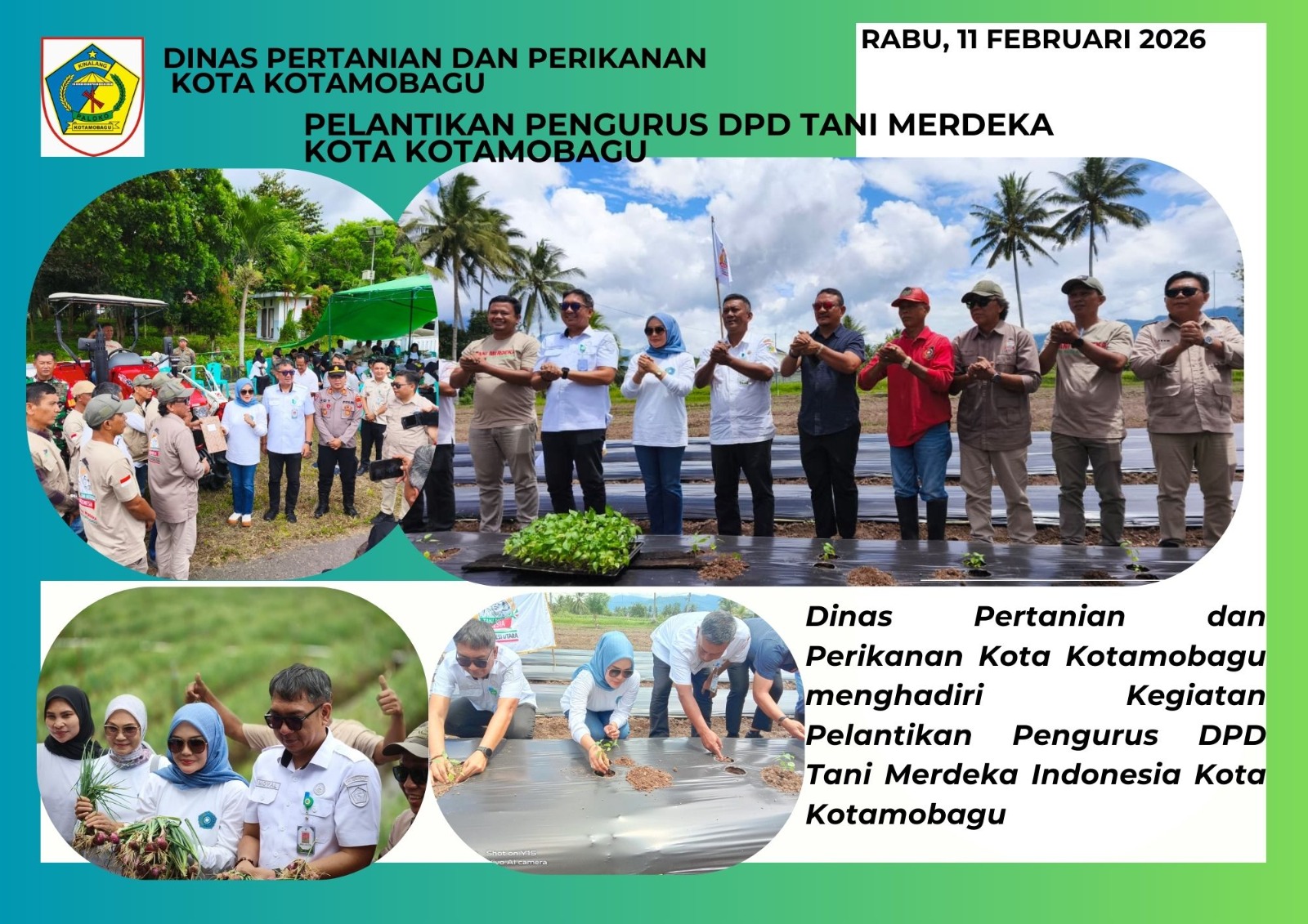 Telusur.news, KOTAMOBAGU — Dinas Pertanian dan Perikanan Kota Kotamobagu menghadiri kegiatan Pelantikan Pengurus DPD Tani Merdeka Indonesia (TMI) Kota Kotamobagu yang dilaksanakan di lokasi lahan Kelompok Tani Berkah, Kelurahan Pobundayan, Kecamatan Kotamobagu Selatan, Rabu (11/2/2026).