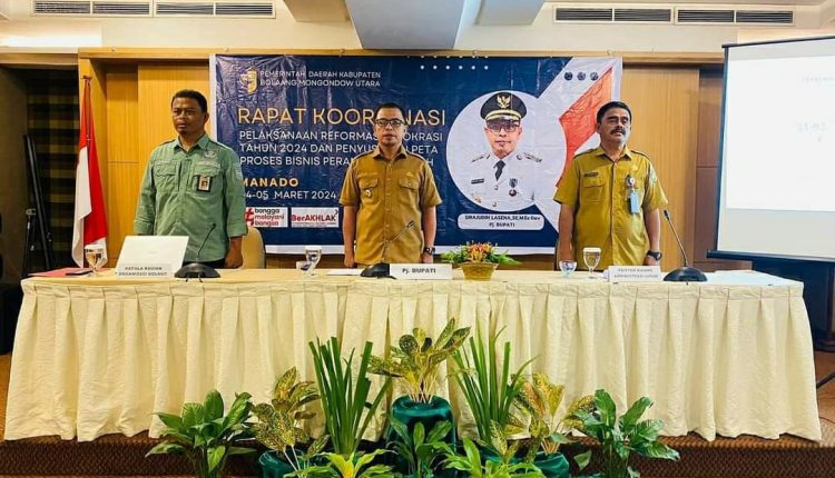 Telusur.news, BOLMUT — Penjabat Bupati Bolaang Mongondow Utara Sirajudin Lasena  Membuka Secara Resmi Rapat Koordinasi Pelaksanaan Reformasi Birokrasi Tahun 2024 dan Penyusunan Peta Proses Bisnis Perangkat  Daerah Tahun 2024 yang di laksanakan di Manado Quality Hotel. Selasa 05/03/2024.